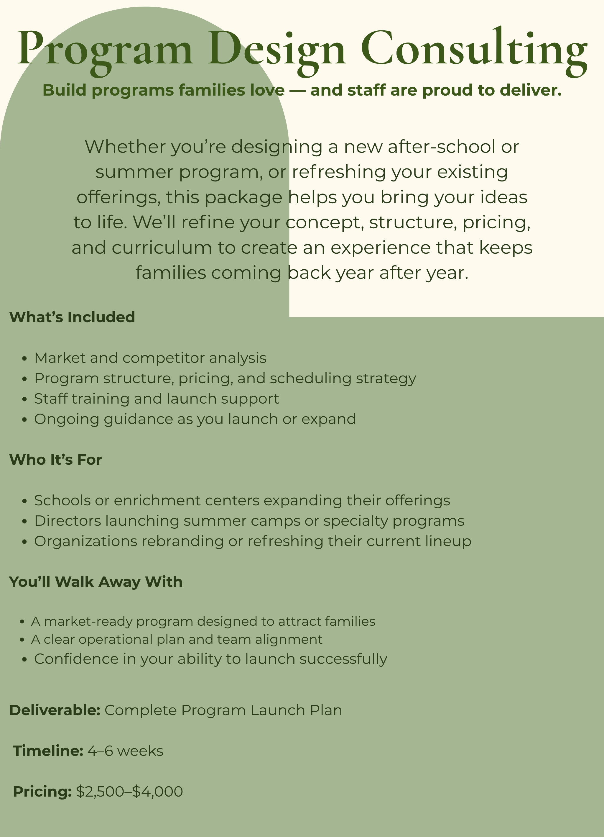 A flyer for Program Design Consulting with a green background and white text. It offers services for building programs that families love, including analysis, structure, pricing, and support. The flyer highlights who it's for, what clients will gain, and pricing details.